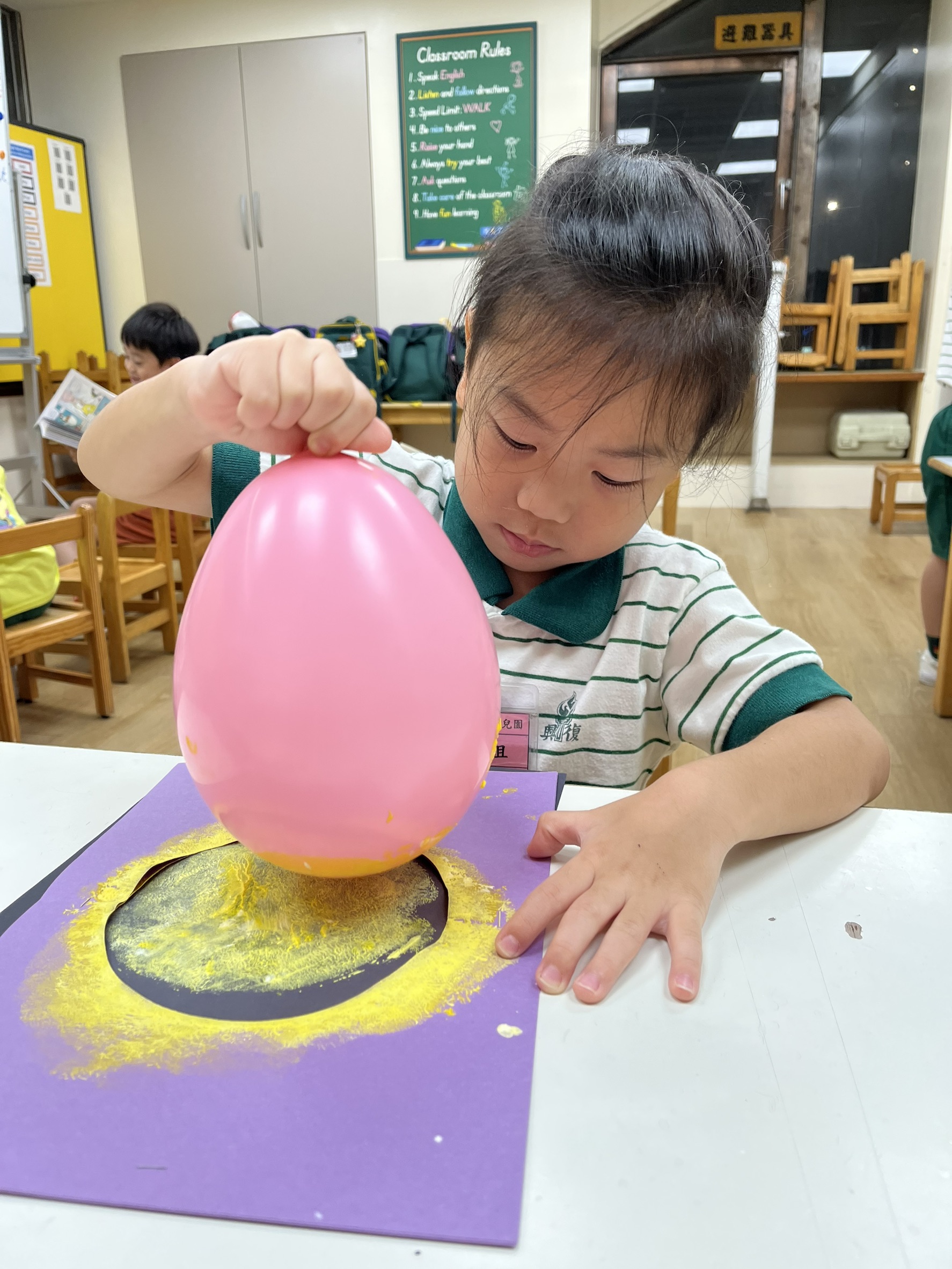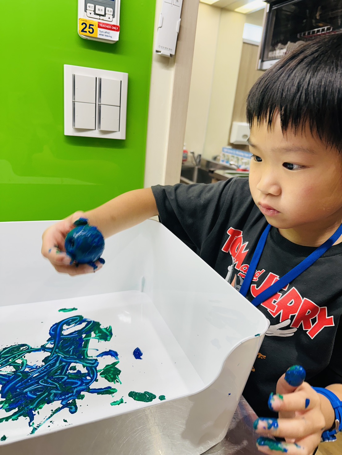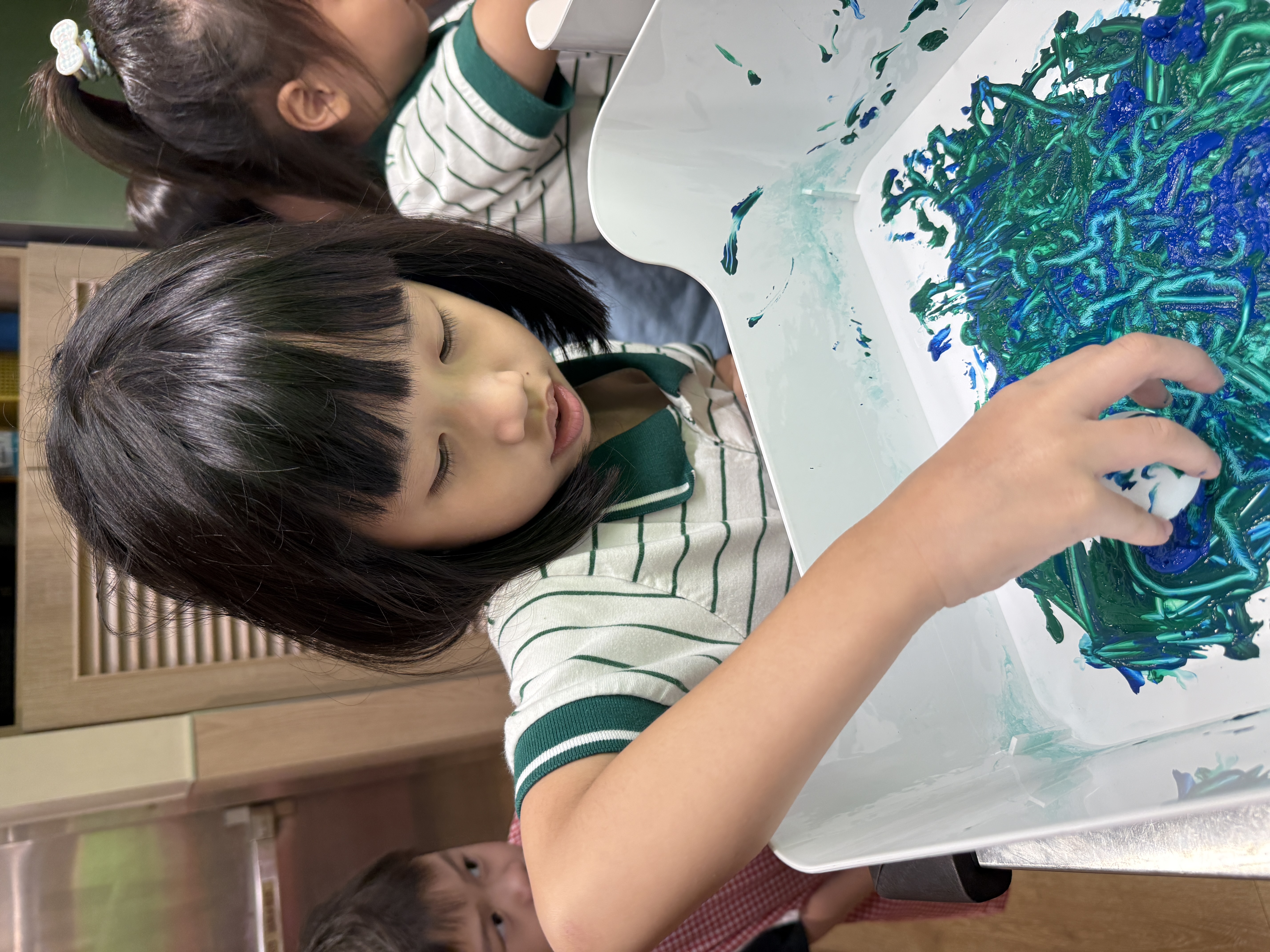 ▲老師準備了好多顏色的顏料,滾呀滾呀就會變成地球了耶!
