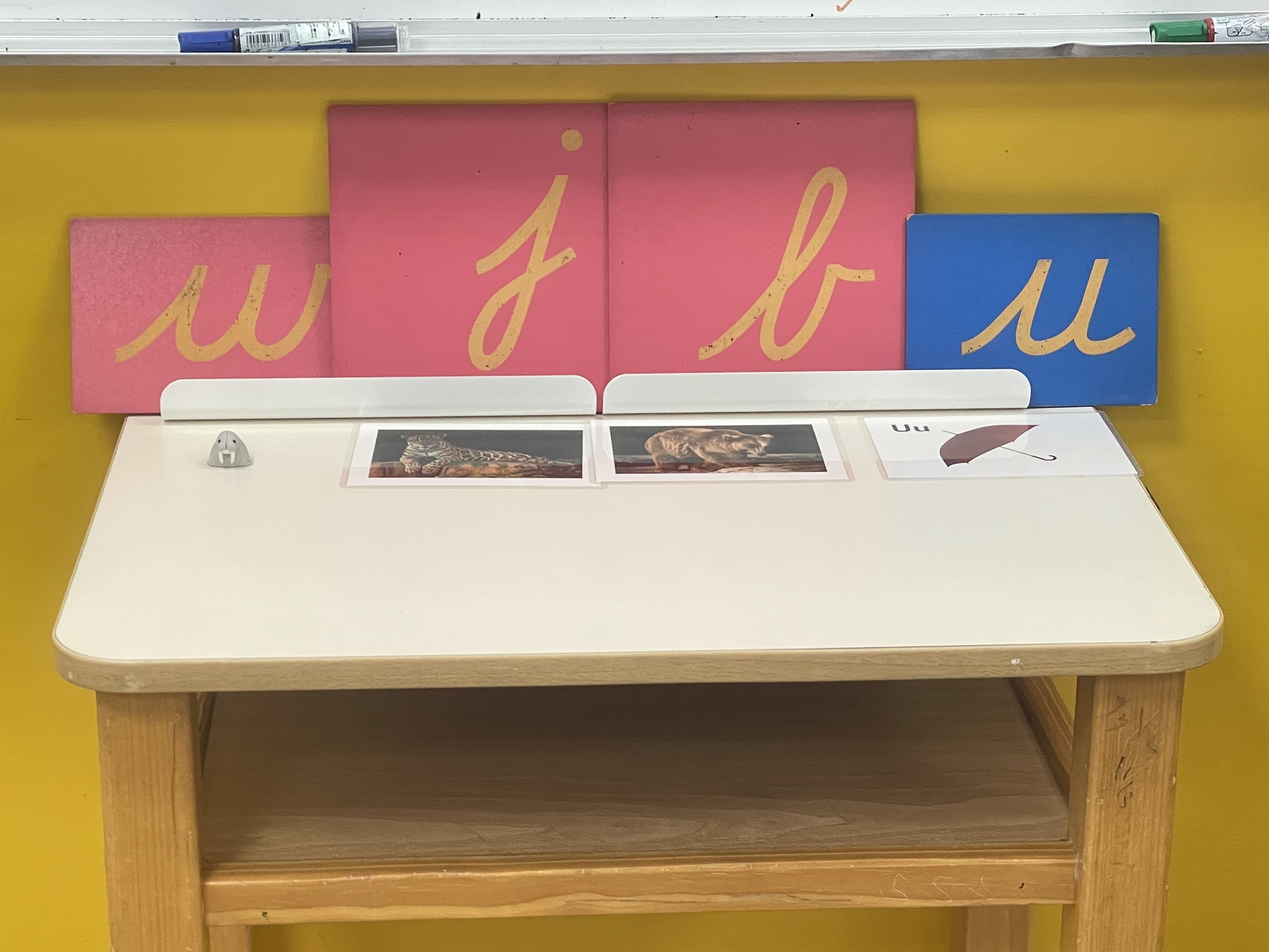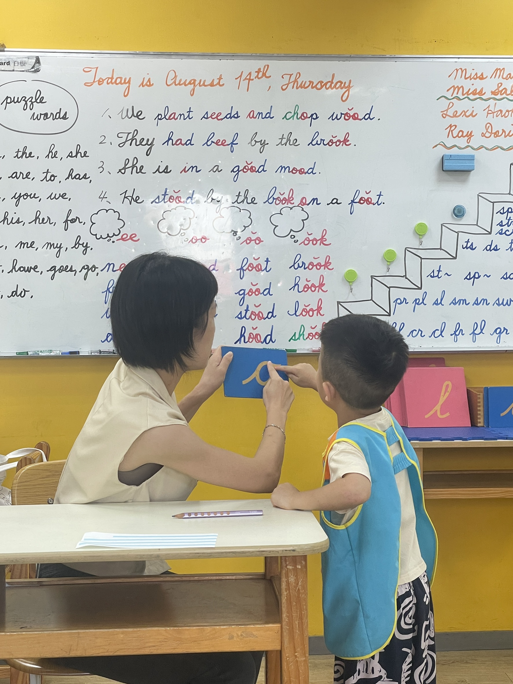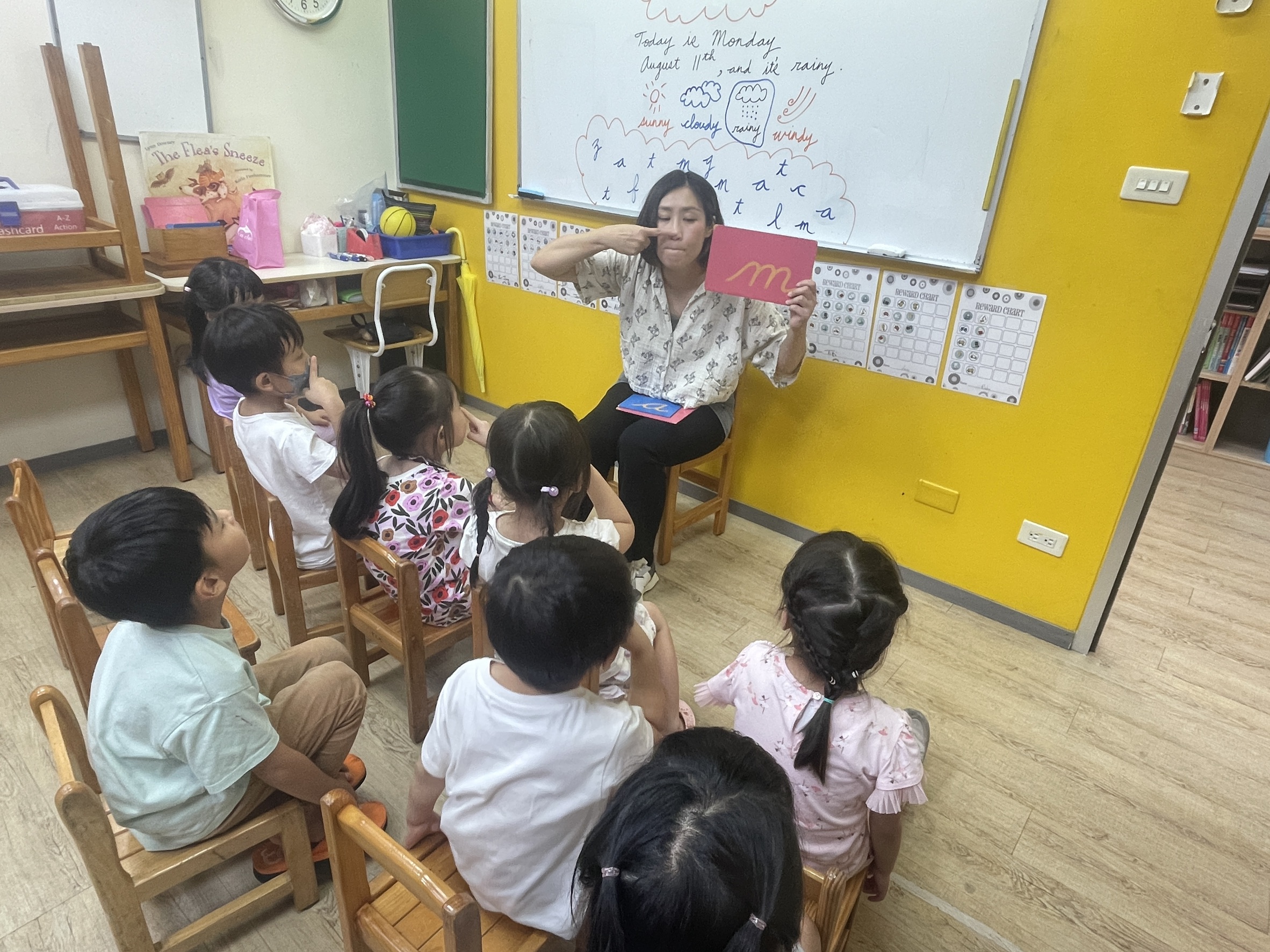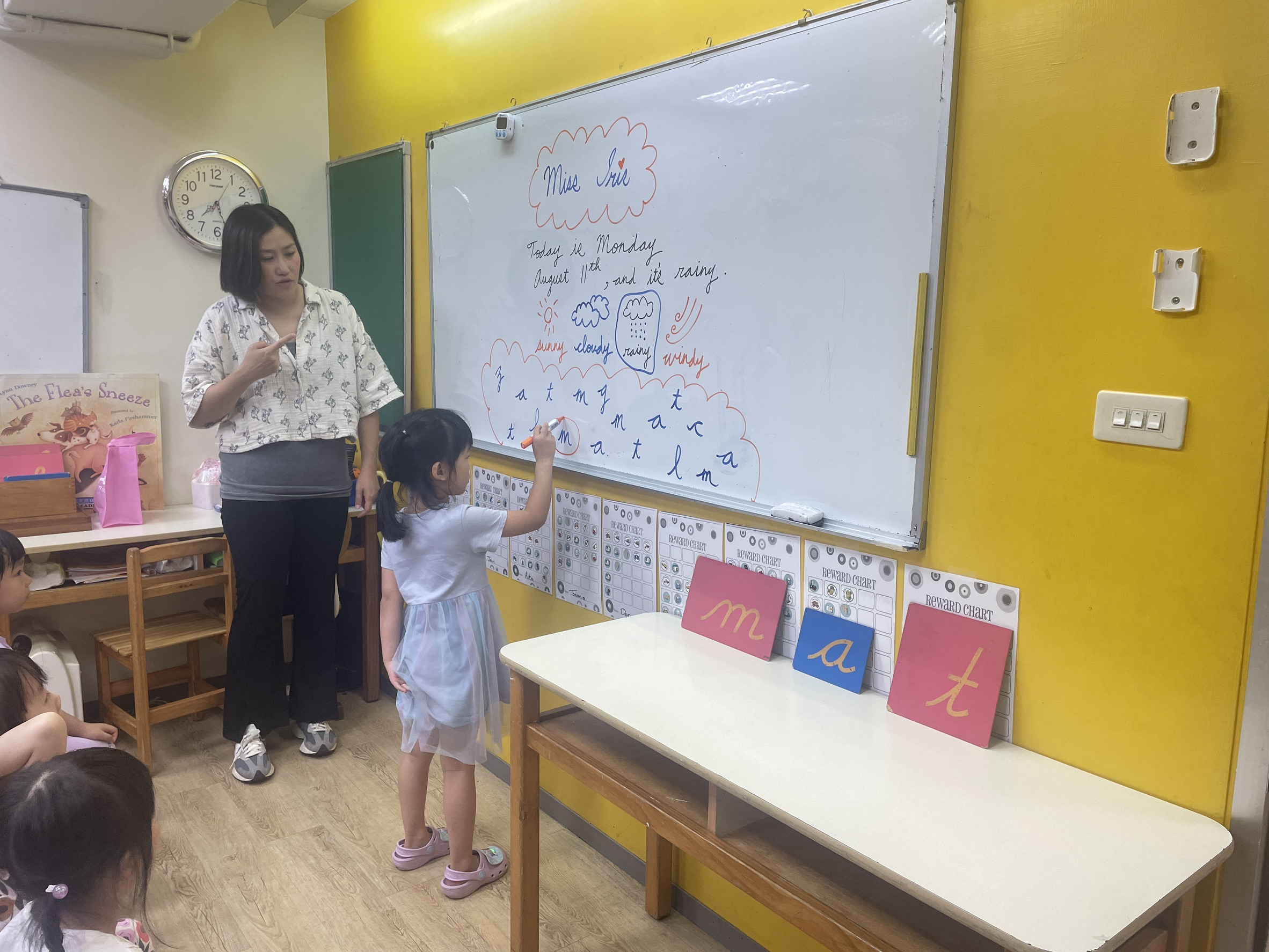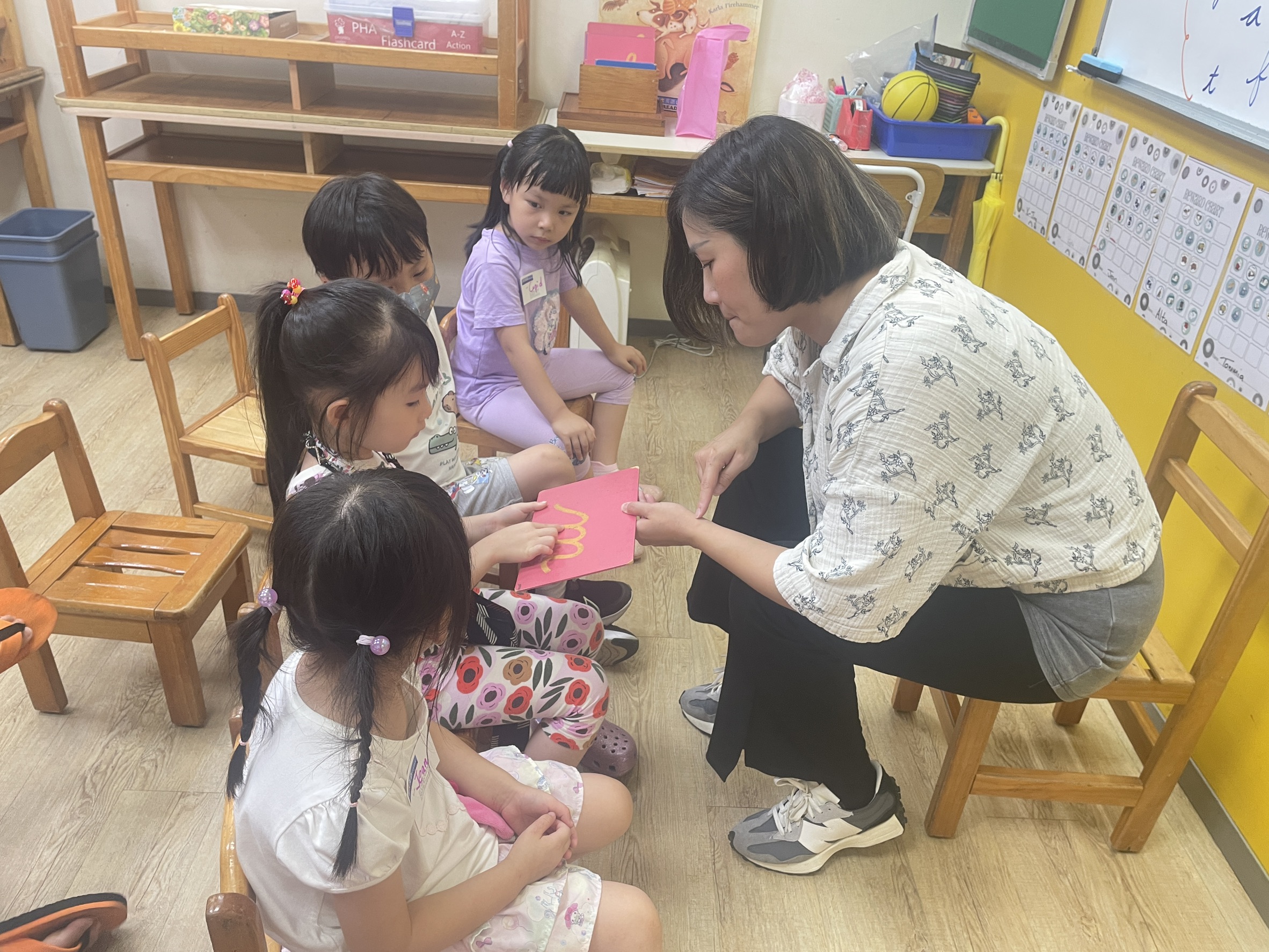 老師使用蒙式教具讓孩子們以感官(觸覺)搭配教授字母的聲音, 幫助孩子們加深聲音的連結