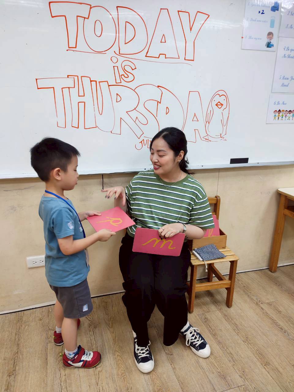 更是利用專業蒙式教具"沙字板"練習見字讀音